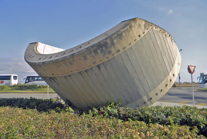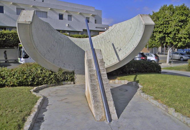A number of less common sundials in modern designs can be found along Palma’s Paseo Marítimo, such as the one shown here, found at the entrance of the Muelle Comercial, straight opposite the Cathedral. This one is a Cylindrical sundial with its gnomon lined-up parallel to the Earth axis.