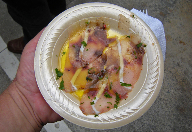 A largish number of hotels, restaurants as well as fishermen’s associations and fishery bodies are presenting a multitude of gastronomic dishes in endless variations of Llampuga concoctions. You’ll be surprised how many ways there are to dissect and prepare the Common Dolphinfish (Coryphaena hippurus), also known as Mahi-Mahi. Llampuga will be served in a Paella rice dish, as a Fideo noodle meal, as a Carbaccio (see photo below), smoked, fried, sizzled, steamed, as a Ravioli stuffing, minced as a Tartar, raw as a Sushi, and in dozens of other gastronomic transformations, one better than the next. I ran out of eating capacity after 10 or 12 different Llampuga dishes, last time I went. I’m happy to go for 10 or 12 more, this weekend.