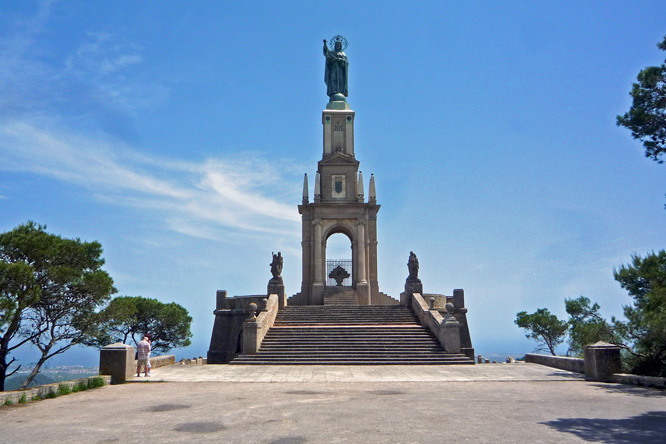 If you know Felanitx, you probably also know the Santuario de la Mare de Déu de Sant Salvador (Monastery of Sant Salvador), some 7 km away from the town. From the distance, one can soon make out the towering monastery building sitting on top of the Puig de Sant Salvador mountain, together with the enormous monument of a Christ figure. The monument of Crist Rei (Cristo Rey) in Felanitx is not quite as imposing as the Cristo de Corcovado in Rio de Janeiro, Brazil, but they both manifest similar proportions and a comparable religious motivation. To be precise, the Brazilian sculpture measures 30 m on top of a 9 m high pedestal, whereas the proportions in Felanitx are the other way round: 7 m of Christ on top of a 37 m tall support. The massive monument in Rio was constructed in reinforced concrete from 1922 to 1931, whilst the Mallorcan monument was built between 1928 and 1934.