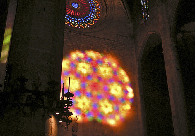 Every year on the day of Sant Martí (November 11th), one can see an awe-inspiring natural light show inside Palma’s Cathedral. Shortly after 08h00, the morning sun enters through the large stained glass window on the Eastern façade and projects the rose window’s colourful pattern on the opposite interior wall, below the Roseton of the main portal. The Cathedral doors, including the main portal, will open earlier than usual that day, Friday, to allow us to appreciate this beautiful spectacle. Admission is free. Don’t come too late; it will all be come and gone within a mere 35 minutes. If you can’t make it this time, the same effect can be witnessed again on February 2nd, come rain or shine. Well, that is not quite true. The suns reflection can’t be seen if the clouds obscure the sunlight from entering the Cathedral. Let’s hope the weather will be as good on Friday as the forecast predicts.