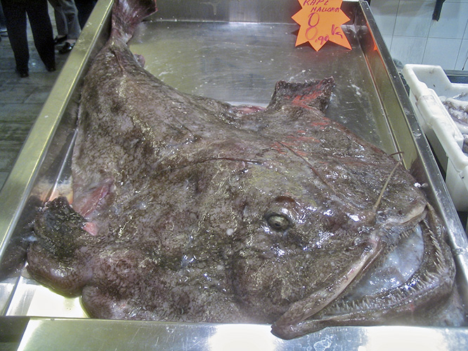 The fish in my photo was a specimen of easily 1 metre in length with a weight well in excess of 10 kilogrammes. Female Rapes can grow up to 2 metres in length weighing up to 45 kg. The local fish markets normally offer skinned and headless Rapes of considerably smaller sizes with perhaps up to 2 kg in weight. In Mallorcan restaurants you will find a variety of Rape recipes, either as a Solomillo de Rape en Salsa, a Caldereta de Pescado with Rape mixed with other fish, or a Frito Mallorquin de Pescado y Marisco. You can also buy Higado de Rape (the Rape fish liver) and try your hand at a delicious Terrine de Foie de Rape without a feeling of guilt. The fish was not force-fed; in fact, Rape is one of the fish varieties that so far has resisted from being fish-farmed.