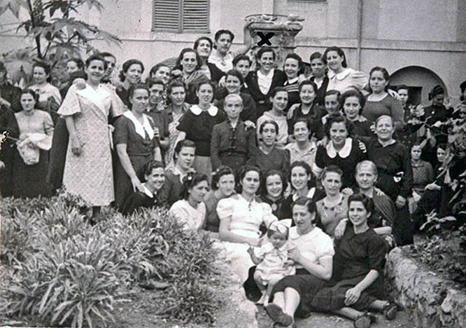 The photo shows a group of female convicts at the prison of Can Sales in Palma, circa 1940. This small group of inmates was imprisoned to a total number of 1,320 years between them. The woman in the back row marked with an X was Matilde Landa who later committed suicide at Can Sales.