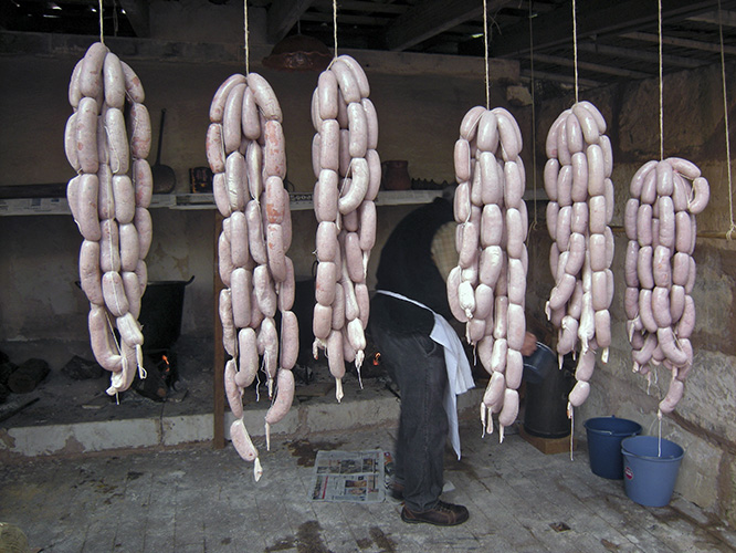 In Mallorca, pigs are raised from as early as March and fattened throughout the year with a view to being sacrificed on or after November 11th (Dia de Sant Martí) and in particular in the lead-up to Christmas when a hearty broth, a festive Frit de Matances or a Christmassy Lomo con Col was always welcome. In the old days, the cured, boiled or fermented pork products were meant to last for the best part of the following year and thus, each small scrap of meat, offal, blood, grease, organs, fat and even trotters was used and carefully processed. Modern times and rules and regulations have resulted in a diminished uptake of these old ways of the slaughtering feast but, in most villages there are still some families maintaining the matança tradition. Yesterday in Sineu, one could witness the individual steps of the matança process at close range and even taste some of the finished products on offer.