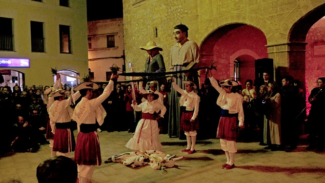 The village (or is it a town?) of Campos celebrated their Patron Saint yesterday, Sant Julià. Festivities started last Friday, January 6th, and will continue until next Saturday, January 14th. Last night was special in as much as a new troupe of Cossiers danced and performed for the first time after perhaps 100 years. There are Cossiers dancers in other Mallorcan pueblos, such as Alaró, Montuïri, Algaida, Manacor, Pollença, Inca and Palma, as well. Campos used to have Cossiers a long time ago, too, but somehow the tradition got discontinued, until now. I went there and saw the defeat of the Dimoni at the hands of the six male dancers together with their female lead Dama. Neat.
