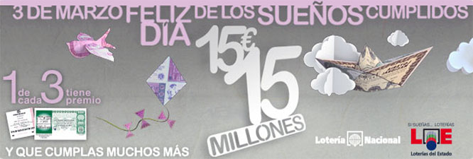 As it happens, the Spanish Lotería Nacional is holding a special draw tomorrow, March 3rd, with a first prize of 15,000,000 €, the Sorteo Extraordinario del Bicentenario de Lotería Nacional. My fantasies are still vivid, and I shall buy a Decimo for 15 €. You may call me a dreamer. Pigs can fly.