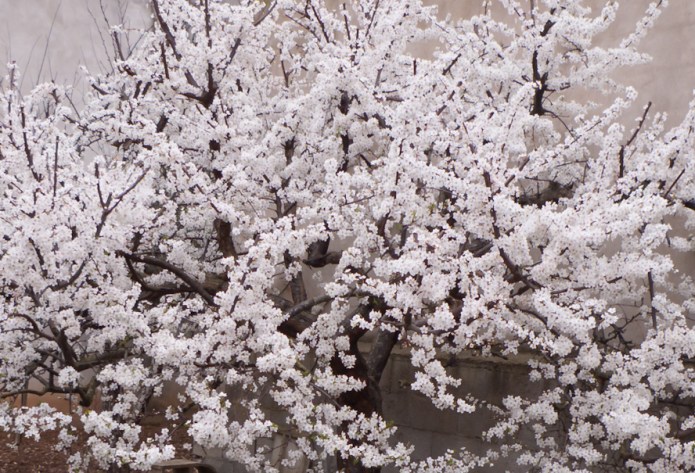 I sometimes wonder whether I like the first Mallorcan Springtime better than the second one, or the other way round. The first Primavera would be in January/February with half the island covered in white and pink almond blossoms, whereas the second Primavera would be now, from mid-March to mid-Aril, when hundreds of fruit trees of the peach, cherry, nectarine, apple, pear, prunes, plums variety and the like are in full bloom. The blossoms in today’s photo would appear to be of the pear variety (Pyrus communis); please correct me if I should be wrong. This pear is native to the island, strange as it may sound, as is the cherry (Prunus mahaleb).