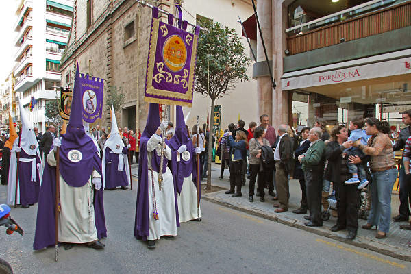 Today, Mallorca celebrates Diumenge des Ram (Palm Sunday), the first day of the dramatic and rather compelling Easter processions, commemorating the entering of Jesus in Jerusalem. Traditionally, on this day, blessed olive branches or dried palm leaves are handed out to the church goers attending the morning mass. This evening, the first of the Easter processions will be held in Palma with the attendance of all the Confrarias (confraternities, or brotherhoods). Last Friday, all of Palma’s Confrarias held their first procession of this year’s Easter proceedings (see photo below), simply manifesting their attendance this year.