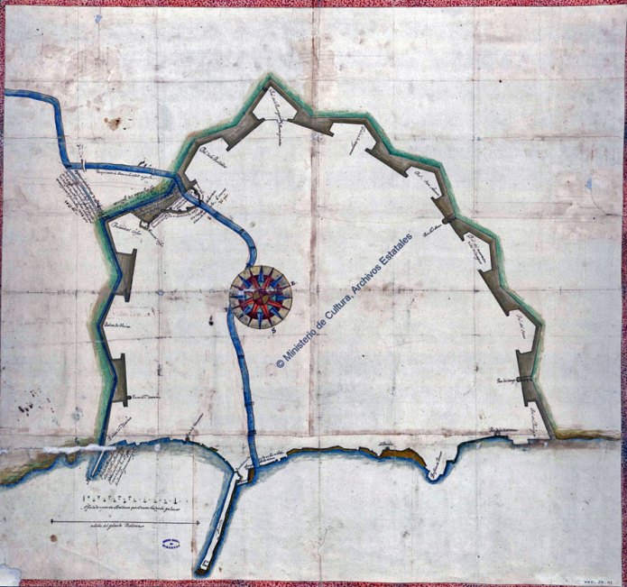 In the old days and for hundreds of years Ciutat, the city of Palma, was surrounded and enclosed by a massive fortified city wall. There were nine puertas (entrance gates) into Palma (see plan centre): Puerta de Santa Catalina, Puerta del Sitjar, Puerta Pintada, Puerta de San Anton and Puerta del Campo (from West to East) as well as Puerta de la Tarazana, Puerta del Muelle, La Portella and Puerta de la Calatrava (facing the sea). The Puerta Pintada was also known as Puerta de Santa Margarita (see image top) as it was situated next to the Baluarte de Santa Margarita, one of Palma’s ten bulwarks.