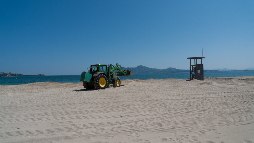 Environmentalists criticize the sucking up of sand from off-shore locations for fear of a destruction of the marine life and in particular, damage to the Posidonia oceanica or Neptune grass which plays an important role in the Mediterranean ecosystem. They also criticize the use of heavy machinery on the beaches such as the digger on the photo above (in Port de Pollença). The uncontrolled use of heavy equipment causes damage to the dune system on some of Mallorca’s beaches and actually compresses the sand in a way that it is less well embedded and thus, prone to be blown away by wind and weather or swept away by the waves of the sea.