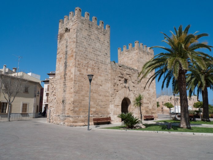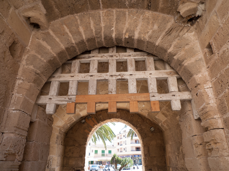 The old town of Alcúdia used to be surrounded by a fortified Mediaeval city wall, built during the 14th century and modified during the 16th century. The Southern and Western remnants of this bulwark are still largely intact; one can climb up and walk along most of its remaining expanse. Two massive gates are part of that wall, Porta de Mallorca, also known also as Porta de Sant Sebastià (the Western gate) and Porta de Xara, also known also as Porta de Moll (the Eastern gate), shown here. The Porta de Xara still preserves its original Mediaeval portcullis, carpentered in wood some 400 years ago (photo below).