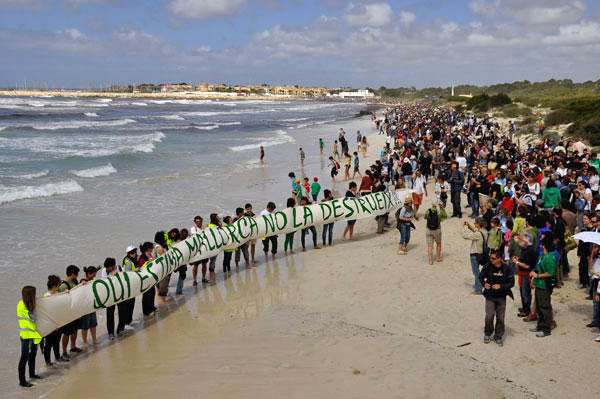 Last Sunday, April 29th, between 5,000 and 10,000 protesters congregated on the beach of Es Trenc in opposition to a change in the planning law that now would allow the construction of a new hotel complex with 1,200 beds right on the boundaries of the protected Nature Reserve of Es Trenc-Salobrar de Campos. The change had come into law only two weeks earlier, on April 12th, when before that date no such construction would have been allowed anywhere near Mallorca’s coastline. The change of heart was legally made possible by the conservative PP party now having a majority mandate in the Consell de Mallorca, in the Balearic government as well as in the central government in Madrid.