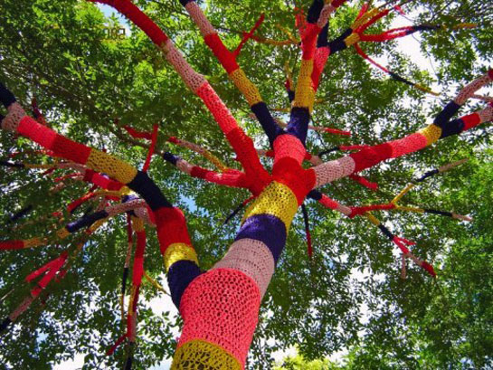 We have heard of guerrilla gardeners, planting gardens in public spaces under the cover of night. And there are guerrilla knitters in New York, Texas, Mexico, London, Canada, Japan and Singapore, amongst other places, drawing our attention to neglected public spaces or simply, wanting to embellish otherwise dreary city landmarks. They are a clandestine group of woolly warriors who do knit graffiti or Knitivism, decorating lamp posts, trees, street signs and public sculptures with their knitted goods. In Spain, cities such as Bilbao, Barcelona, Valencia and Madrid have seen urban knitting over the last two years.