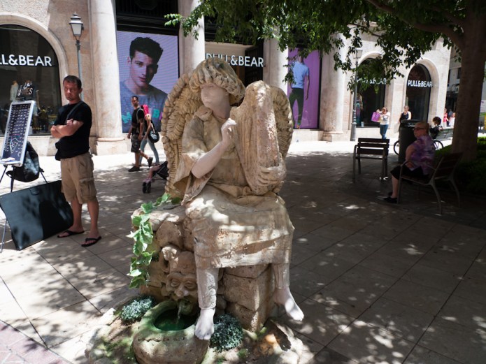 There are dozens of Living Sculptures in Palma’s streets and squares, ready for donations from the passers-by and in the main, from tourists. You may have seen some of these street mime artists yourself; there is a Charley Chaplin, a Flamenco dancer, a Zorro swordsman, a levitating China man, a Dracula figure and there are lots, lots more. Some of the mime artists are incredibly clever in their presentation, some are simply funny, in a good way, some are ever so intricate in their act. The best living sculpture I’ve seen in a long time is one I came across last Saturday (see photo). The act resembled a sculpture set in stone which came to life to play the stone lyre. The act included a fountain with running water and recorded lyre music activated only for the duration of the coming-to-life. Incredible. It was like a dance without any movement.