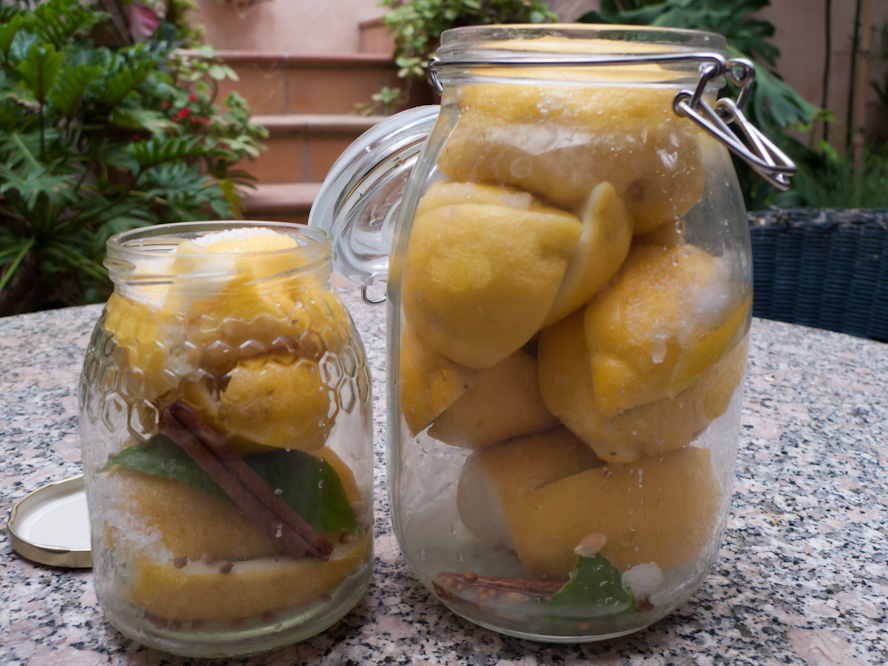 Use smaller lemons if you can, scrub them with a vegetable brush and dry them. Always use organic or unsprayed lemons, if possible. Cut off the little rounded bit at the stem end of the fruit. Make a large cut from the other end of the lemon, slicing lengthwise down, but don’t cut all the way through. Cut once more from the opposite angle, so your lemon is incised with an X shape. Pack coarse salt into the lemon where you made the cuts. You can use about 1 tablespoon of salt per lemon. Don’t be skimpy with the salt: use about 1 tablespoon per lemon. Never use ordinary table salt, for its rather chemical taste. I recommend sea salt or, here in Mallorca, Sal de Cocó. Put the salt-filled lemons in a clean, large glass jar with a tight-fitting lid. You can add some extra spices if you want, such as a few coriander seeds, a bay leaf, a dried chilli, and a cinnamon stick, or a combination of any of these. Press the lemons very firmly into the jar to get the juices flowing. The lemons have to be covered by the liquid, so, if necessary, add some more lemon juice from some spare lemons. Cover and let stand overnight.