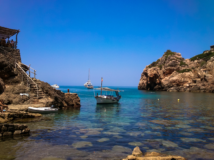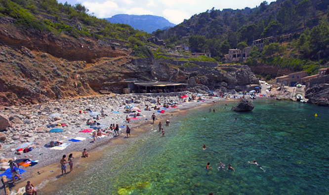 Cala Deià is a very picturesque, tiny pebbled beach near Deià. The beach is famous for its association with Robert Graves who came here for his daily swim during the Fifties and Sixties. The Cala was further immortalized by Anaïs Nin in an erotic short story called Mallorca. The cove is a beautiful sea inlet, surrounded by rocky cliffs, giving it a feeling of a hidden paradise; a torrent flows into the sea during the rainy season and there are some fantastic terraces. The views are truly stunning. Two bars serve refreshments and some food, including some fish which can be excellent. The water is crystal clear. The walk down the winding path to the Cala is well worth it, especially in mild weather. I went there just after Easter when the cove was absolutely deserted and peaceful; of course, then, the water was too cold for a swim. When I went there last week, the sun was too hot for a long walk and the small beach was too crowded for my liking. In the Summer, the beach is teeming with local visitors, some rich and famous, and the obligatory tourists. I may give it another try in September.