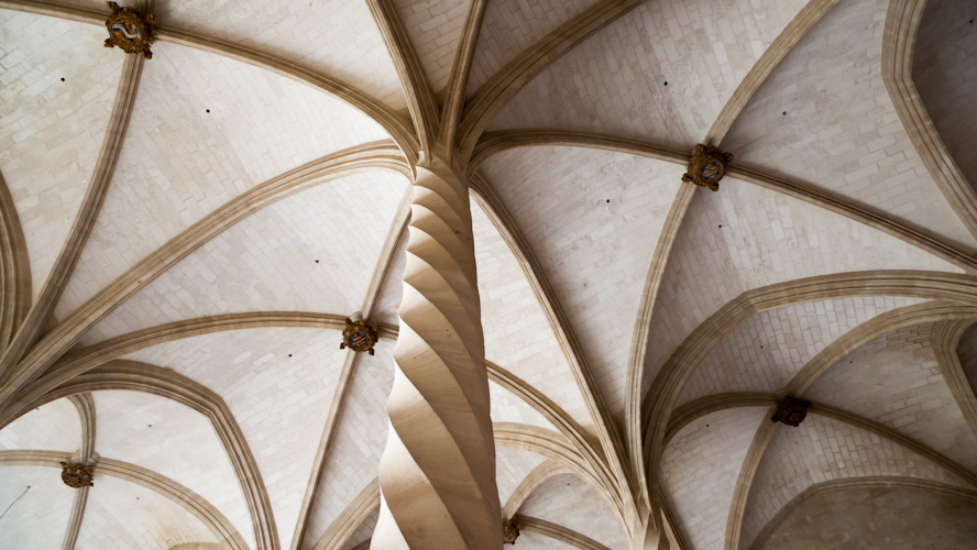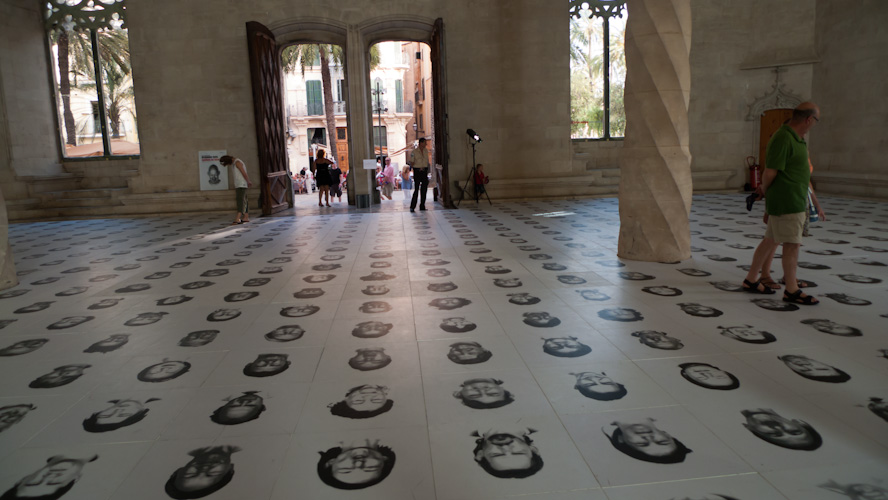 The Mediaeval trade exchange was closed for three years for some extensive restoration work. Since it has been reopened, the place was only open for a couple of days to be shown and presented in its new glory. Then an art installation was presented last year, Llaüts Light, by Fabricio Plessi. The installation was fabulous but one could see nothing of the building’s splendid interior as the setting was all dark and blue. After that show, the Llonja was closed again, until now. I would recommend a visit to the Walking on Faces exhibition for two reasons: go, if you are interested in one of the finest buildings in Palma, in fact, in all of Mallorca. And go, if you should have presented yourself as one of the 1,878 faces participating. It sure is a nice feeling to be part of a larger project in such a prime location. You may have to spend quite some time before you find your portrait, but if you do, your face will light up, I am sure of that. If none of the above applies, go anyway. Walking on thousands of largely anonymous identities is perhaps part of the creative project of this exhibition. If nobody goes and treads on the faces, no wear and tear will occur and perhaps that deterioration is needed before one can see more than the flatness that is so obvious at this moment in time.