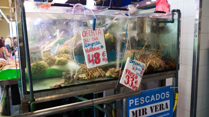Bogavantes are known in the English language as the European lobster or Common lobster (Homarus gammarus). The ones sold in Palma’s markets are predominantly caught in the Atlantic waters around Galicia, even though they live along the Moroccan coast as well, and in the Eastern part of the Mediterranean Sea. They are the ones with the big, fat claws. They are commonly sold live with their claws restrained by elastic bands. Occasionally you can buy them live and swimming in a tank without any harness, such as shown here (photo top). Bogavantes are sold these days for between 32 € and 48 €, but they can go up to 70 € at times.