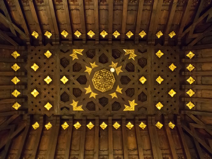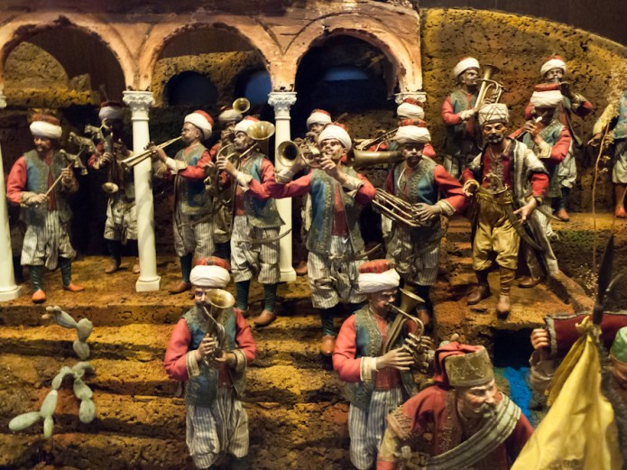 The Fundació Bartolomé March was inaugurated in 2003 as a museum and as a library. The museum owns a collection of scultures by contemporary artists such as Henry Moore, Eduardo Chillida, Max Bill, Barbara Hepworth, Auguste Rodin and others, a collection of maps and portolan charts by Mallorcan cartographers from the 15th and 16th century, a beautiful 18th century nativity scene from Naples composed of 2,000+ pieces (photo bottom), as well as some imposing Mudéjar coffered ceilings (photo centre). It also houses some impressive salons and ceilings designed by Josep Maria Sert with impressive murals by him (photo top). There are also some prints by Salvador Dalí which I don’t consider of great importance.