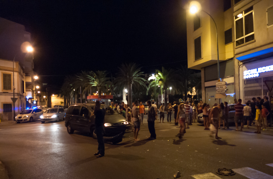 Last night, having just finished a latish supper, our son was waiting for a friend to arrive. They were ready to go to some verbenas in Montuïri, a pueblo half an hour’s down the road from Felanitx. Suddenly we heard a screeching noise and a bang. Our daughter wondered if it was a fire cracker. Then the phone rang. It was our son’s friend, saying that he had just been involved in a car accident. We went out immediately, because the accident scene appeared to have been just down the road from our house judging by the bang that we had heard.