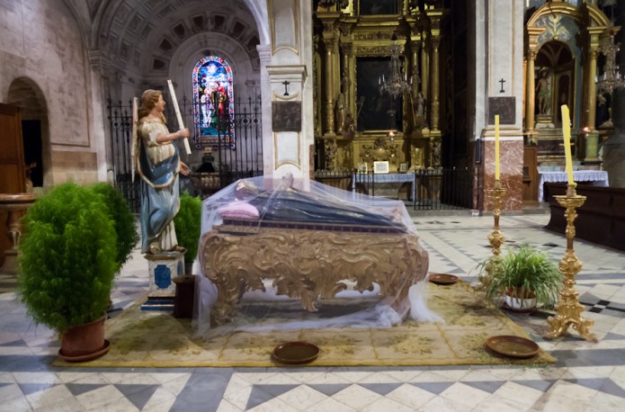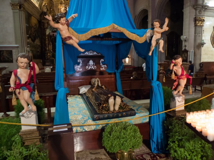 I have visited a number of church exhibitions of the Slumbering Beauties over the last number of years and this year, was all intent on filling in the gaps that I might have missed in the past. Easier said than done. When I was in Palma last Friday, I approached six churches plus the Cathedral but, I found myself locked out in all of them but two. Saturday and Sunday, the same happened in the pueblos. Of seven churches, only three were open for visits at the time of my arrival. For your perusal, I am offering you reclining Mare de Déu Dormida examples taken in – from top to bottom – La Seu (Cathedral) and Sant Miquel in Palma, and Campos, Felanitx, Santanyí and Porreres in the Part Forana (the hinterland). I was told that the most beautiful Virgin Mary statue was laid out in the parish church of s’Arracó (Església de Sant Crist), but I did not get there before time and the display there is now no longer on view, until next year.