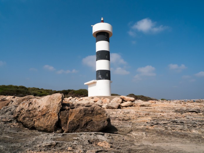 I am not quite sure what a Baliza is. From afar it looks just like any old lighthouse. Perhaps a Baliza is a secondary lighthouse of smaller proportions with a shorter reach of signal. Anyway, the Baliza de sa Punta Plana can be found near s’Estanyol de Migjorn (419 inhabitants), not far from Sa Rapita. The small lighthouse is not listed on the Faros de Baleares (Balearic Lighthouses) website, nor is any other smaller lighthouse such as the one in Colònia de Sant Jordi, to give just one more example. But let me quote from that website; there seems to be a classification by focal distance of lighthouse signals: